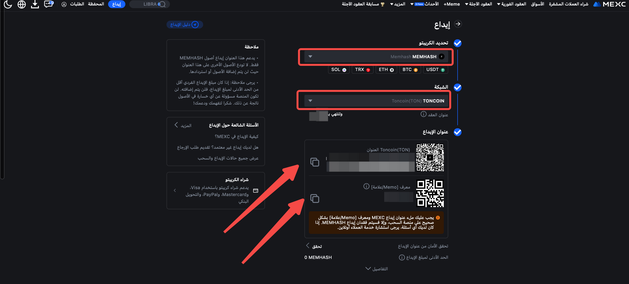 انتقل إلى [المحفظة] > [إيداع] > [اختيار العملة - MEMHASH] > [الشبكة - TONCOIN] > انسخ عنوان الإيداع وMemo.