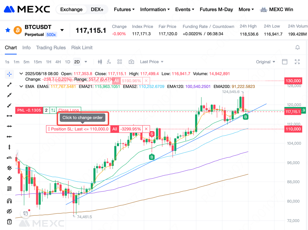 بعد تعيين طلب اخذ الأرباح/وقف الخسارة، ستظهر التوكن المقابلة على مخطط الشموع عند مستويات الأسعار التي اخترتها. مرر مؤشر الماوس فوق رمز اخذ الأرباح/وقف الخسارة، وستظهر لك رسالة "انقر لتغيير الطلب". سيؤدي النقر عليها إلى فتح نافذة "اخذ الأرباح/وقف الخسارة لسعر السوق"، حيث يمكنك تعديل سعر اخذ الأرباح/وقف الخسارة. انقر فوق "تأكيد" لحفظ التغييرات.