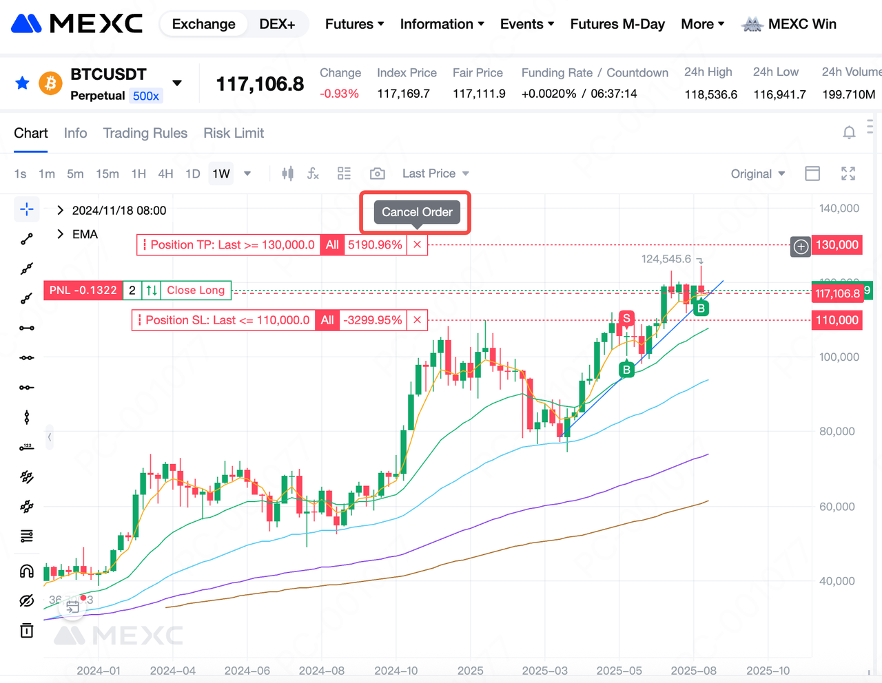 على مخطط الشموع، يظهر زر X في أقصى اليمين لكل أيقونة طلب الحد. عند تمرير مؤشر الماوس فوق X، سيظهر نص "إلغاء الطلب". انقر على X لإلغاء الطلب.