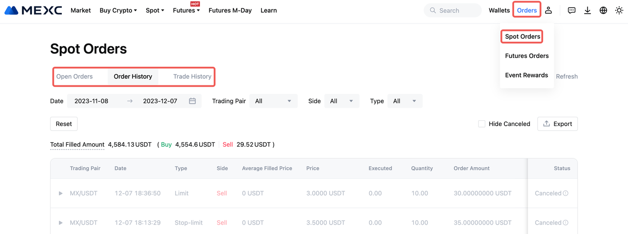 Um Ihren Auftragsverlauf zu überprüfen, klicken Sie auf [Aufträge] in der oberen rechten Ecke der offiziellen MEXC-Website und wählen Sie [Spot-Aufträge]. Hier können Sie auf Aufzeichnungen für alle Ihre Spot-Aufträge und -Transaktionen zugreifen.