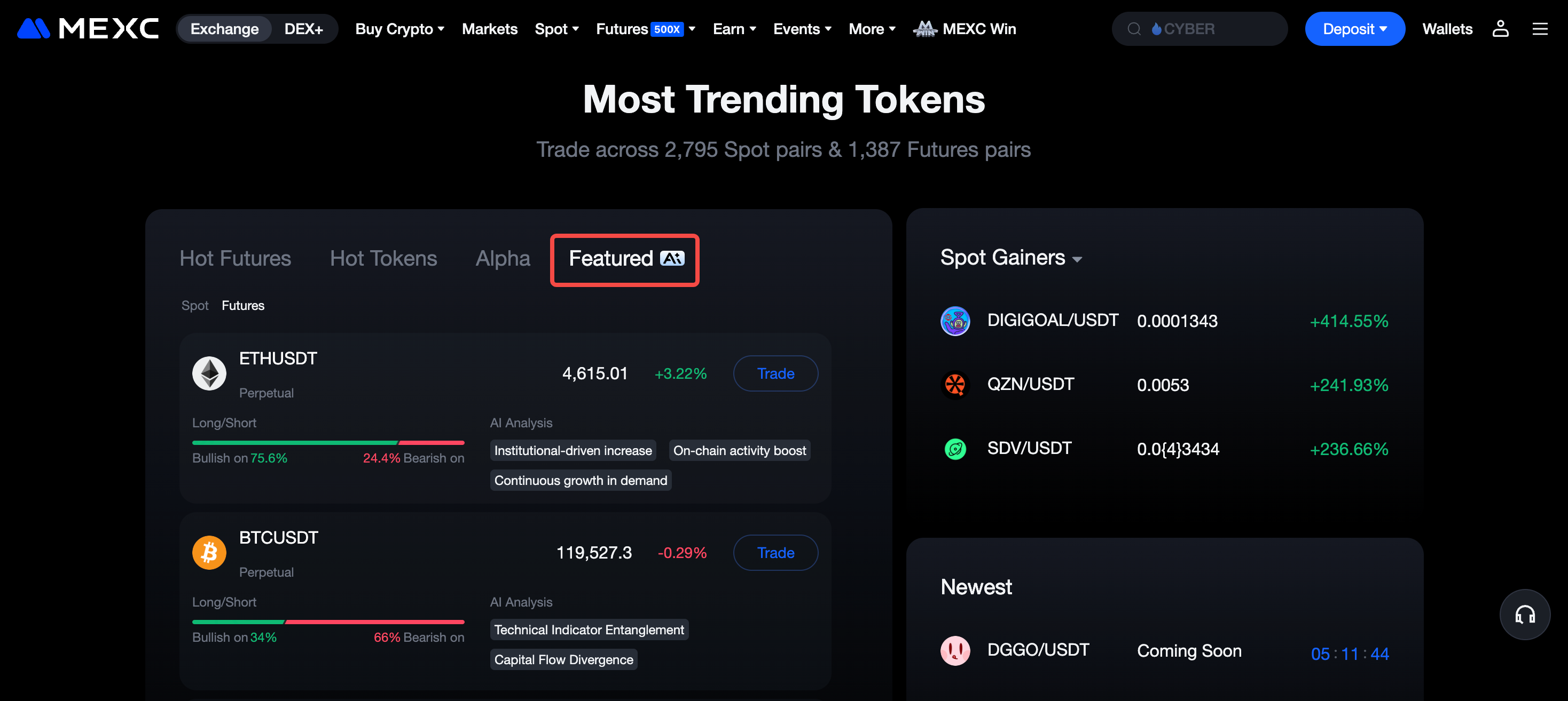 Alternativ können Sie auf der Startseite der offiziellen MEXC-Website nach unten scrollen und unter dem Abschnitt „Meisten angesagten Token“ auf „Hervorgehobene KI“ klicken, um Long-/Short-Informationen sowie Signal-Tags für verschiedene Handelspaare im aktuellen Markt anzuzeigen.