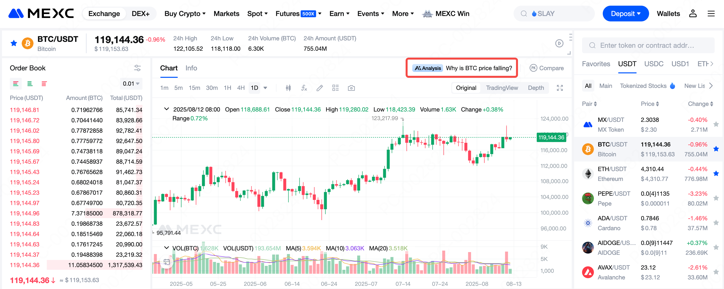 1) Öffnen Sie die offizielle MEXC-Website und melden Sie sich an. 2) Klicken Sie in der oberen Navigationsleiste auf „Spot“. 3) Klicken Sie auf der Spot-Handelsseite auf den Hinweis „KI-FAQ“, der unter dem Namen des Handelspaares angezeigt wird, um in die KI-Bot-Konversationsoberfläche zu gelangen und eine objektive Analyse sowie Begründungen für die Kursbewegungen dieses Tokens zu erhalten.