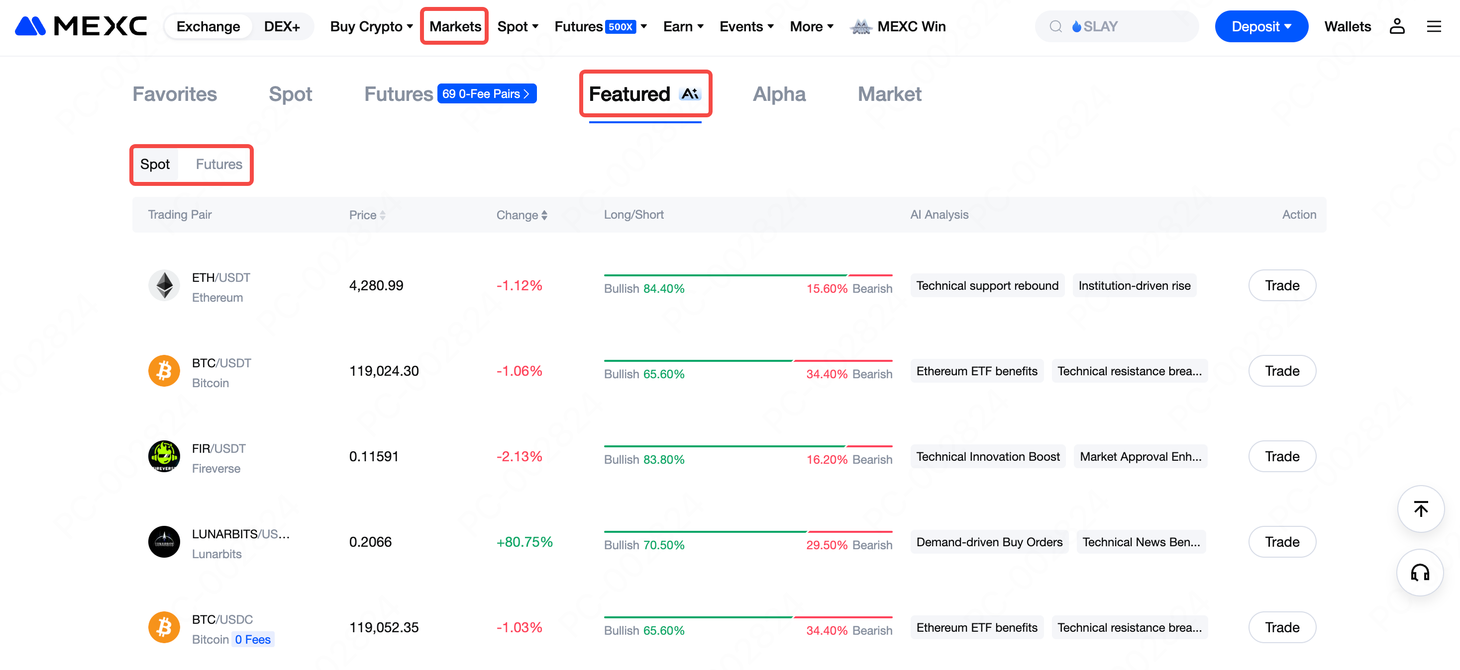 1) Öffnen Sie die offizielle MEXC-Website und melden Sie sich an. 2) Klicken Sie in der oberen Navigationsleiste auf „Märkte“, um zur Märkte-Seite zu gelangen. 4) Wechseln Sie den Seiteninhalt zur Spot- oder Futures-Liste, um Long-/Short-Informationen und Signal-Tags für verschiedene Handelspaare im aktuellen Markt anzuzeigen.