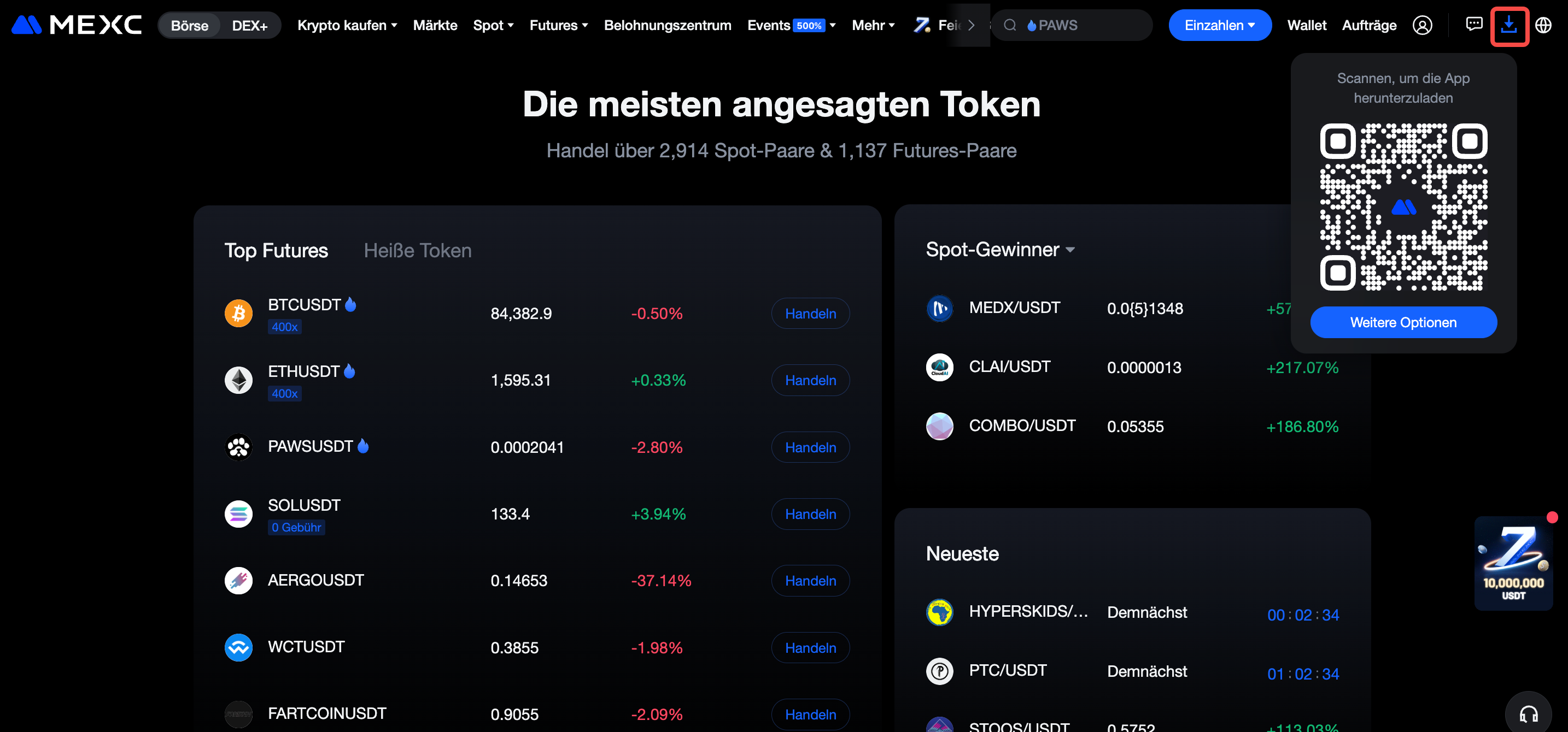 Suchen Sie die offizielle MEXC-Webseite auf und loggen Sie sich ein. Bewegen Sie den Mauszeiger in die obere rechte Ecke der Webseite – dort erscheint das Symbol „Scannen zum Herunterladen der App“. Scannen Sie den angezeigten QR-Code mit Ihrem Smartphone und folgen Sie den Anweisungen, um die Installation abzuschließen.