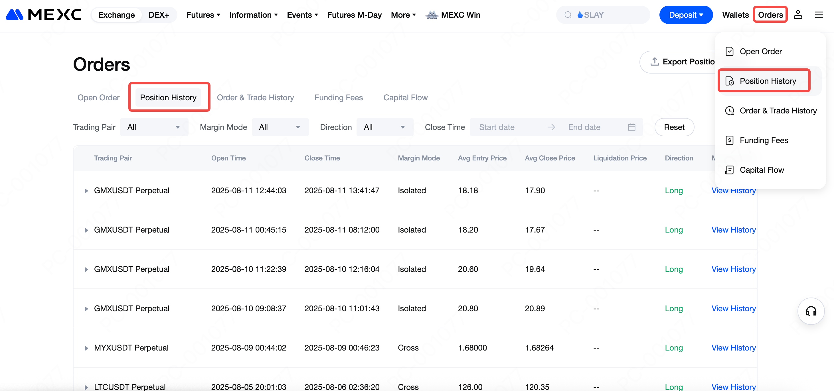 Si quieres revisar tus operaciones pasadas, ve a la esquina superior derecha y selecciona Órdenes → Historial de posiciones.