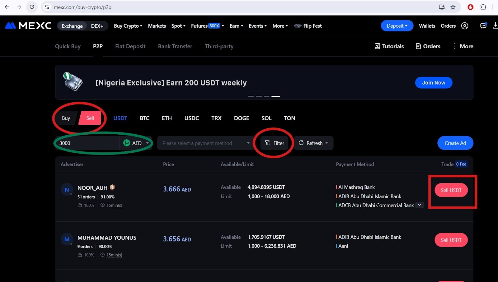 Filtrar ofertas: Elige la moneda fiat, el método de pago y el monto; ordena por las mejores tasas.