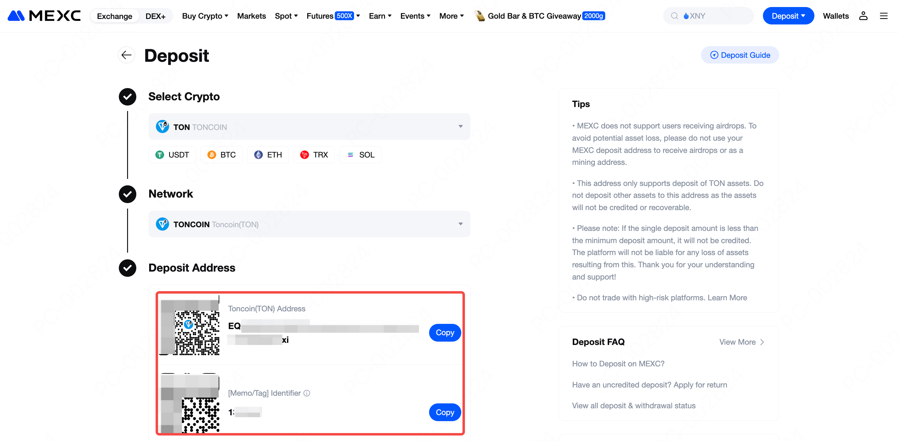 - Requisito de memo: Algunas redes (como TON) requieren tanto una dirección como un memo/tag. Si el memo/tag falta o es incorrecto, el depósito no podrá ser acreditado.