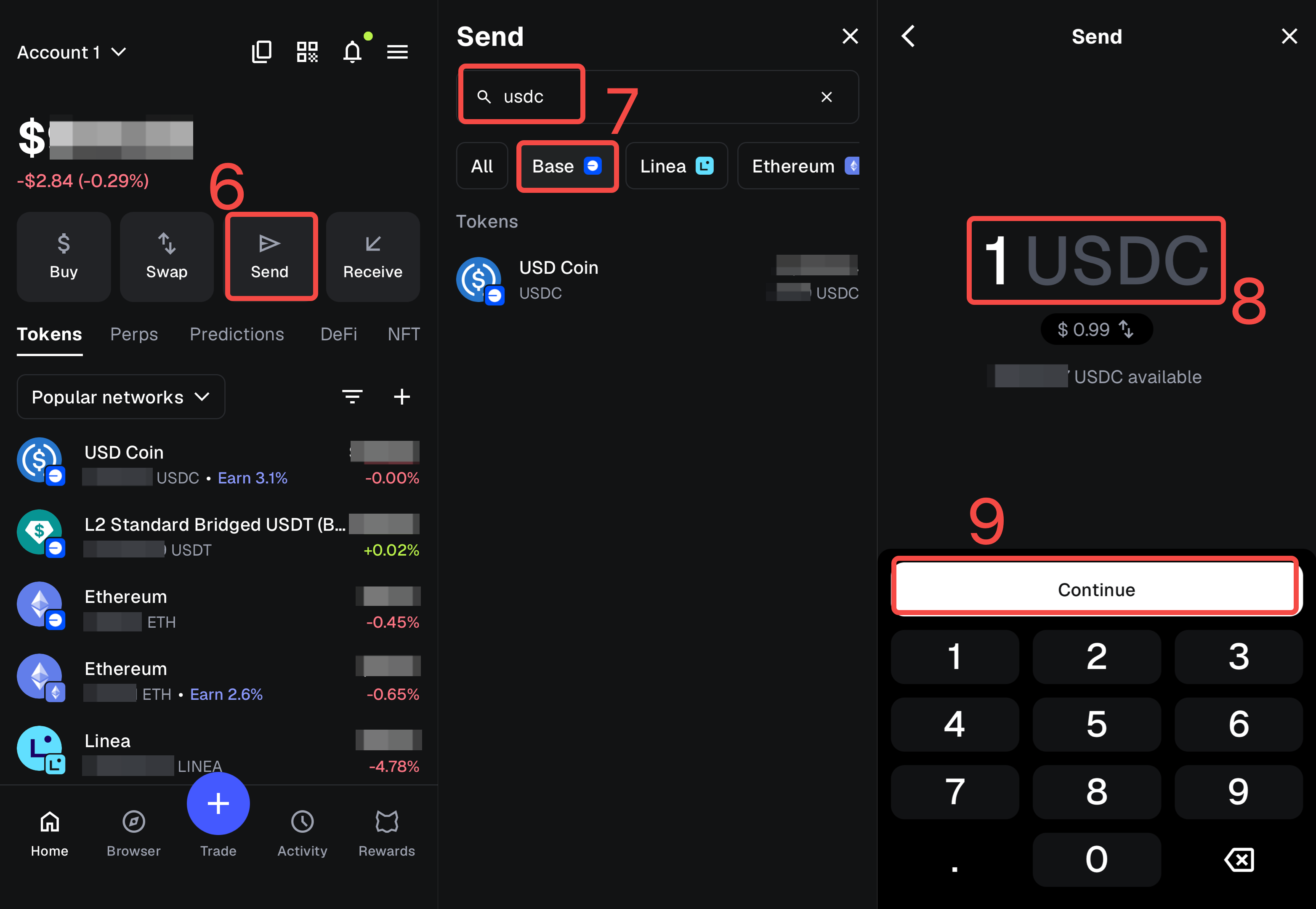 2) En el campo de búsqueda, ingresa USDC y asegúrate de que la red actual esté configurada en Base.