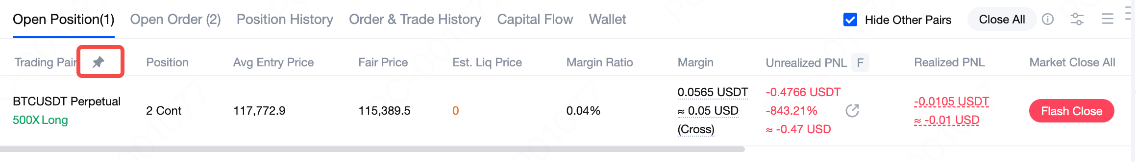 Esto funciona de manera similar a la función de congelar paneles en Excel. Junto a Par de trading bajo Posiciones abiertas, hay un botón 📌 de pin. Una vez que hagas clic, la columna Par de trading quedará congelada.