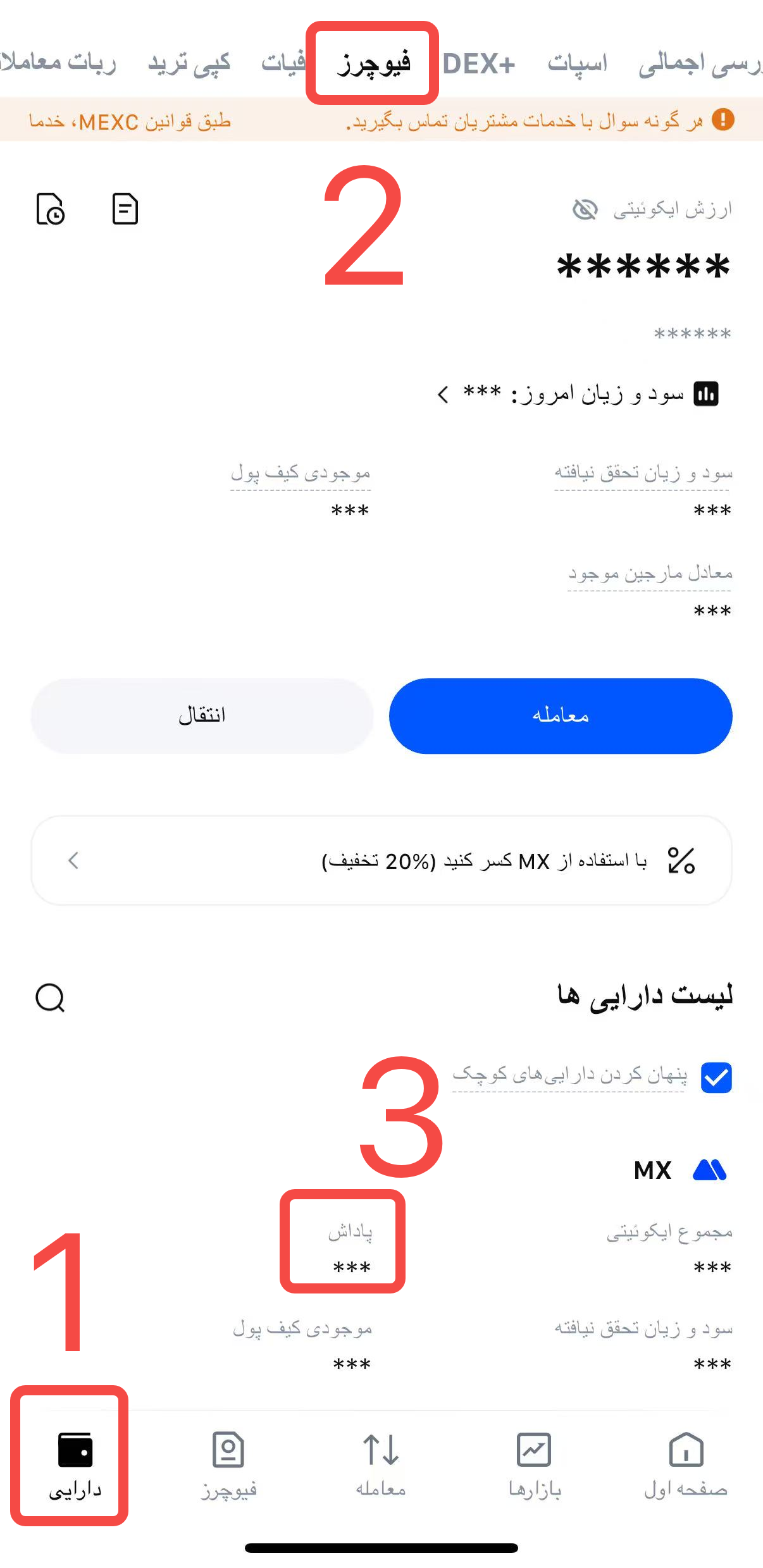اپلیکیشن MEXC خود را باز کنید و وارد آن شوید. در تب دارایی، روی فیوچرز ضربه بزنید و در زیر فهرست دارایی ها، زیر USDT می توانید موجودی پاداش معاملات فیوچرز خود را مشاهده کنید.