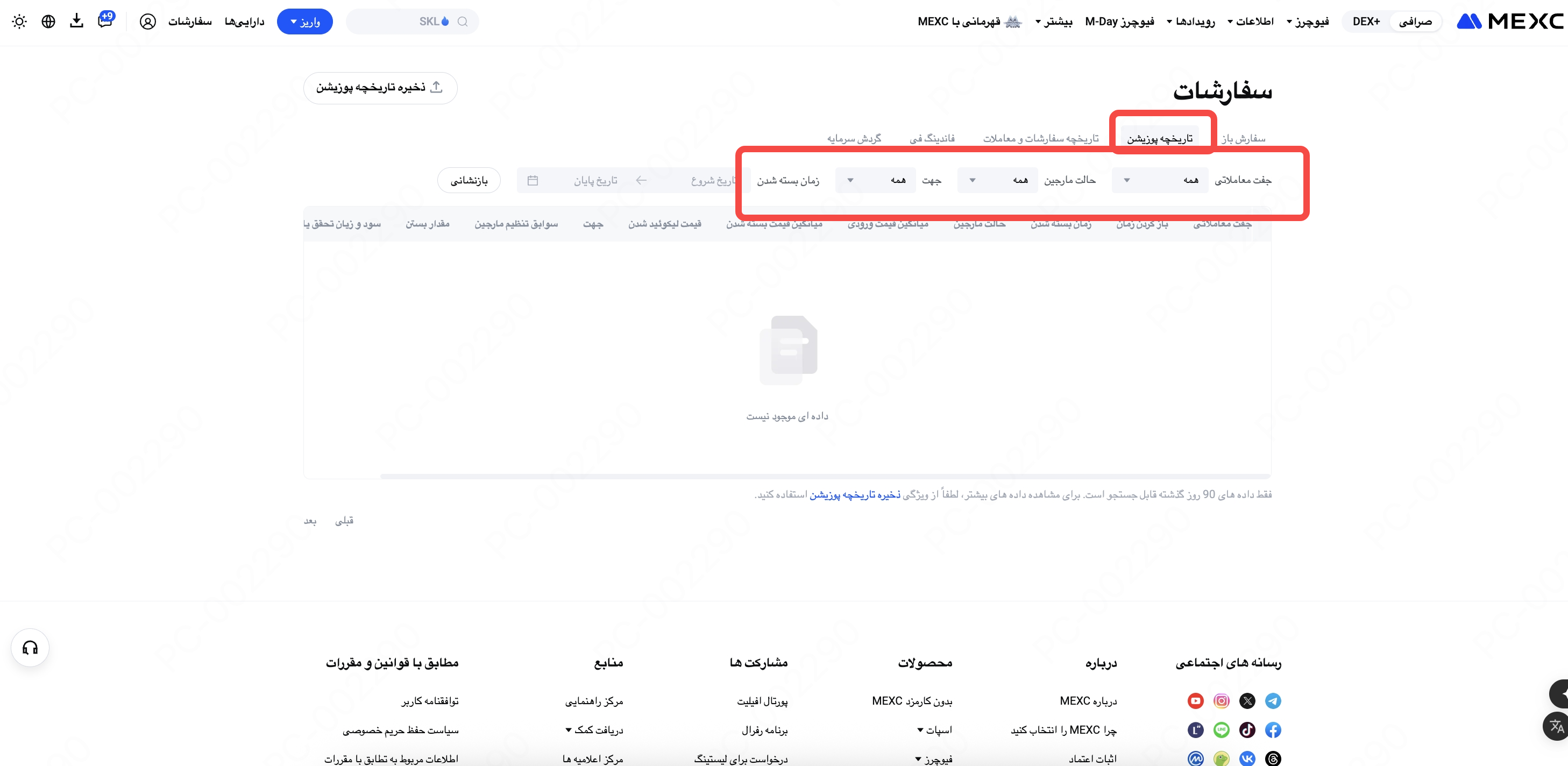 برای یافتن دقیق تر داد ههای تاریخچه پوزیشن مورد نیاز، میتوانید با استفاده از جفت معاملاتی، حالت مارجین، جهت پوزیشن، زمان بسته شدن و سایر پارامترها فیلتر کنید.