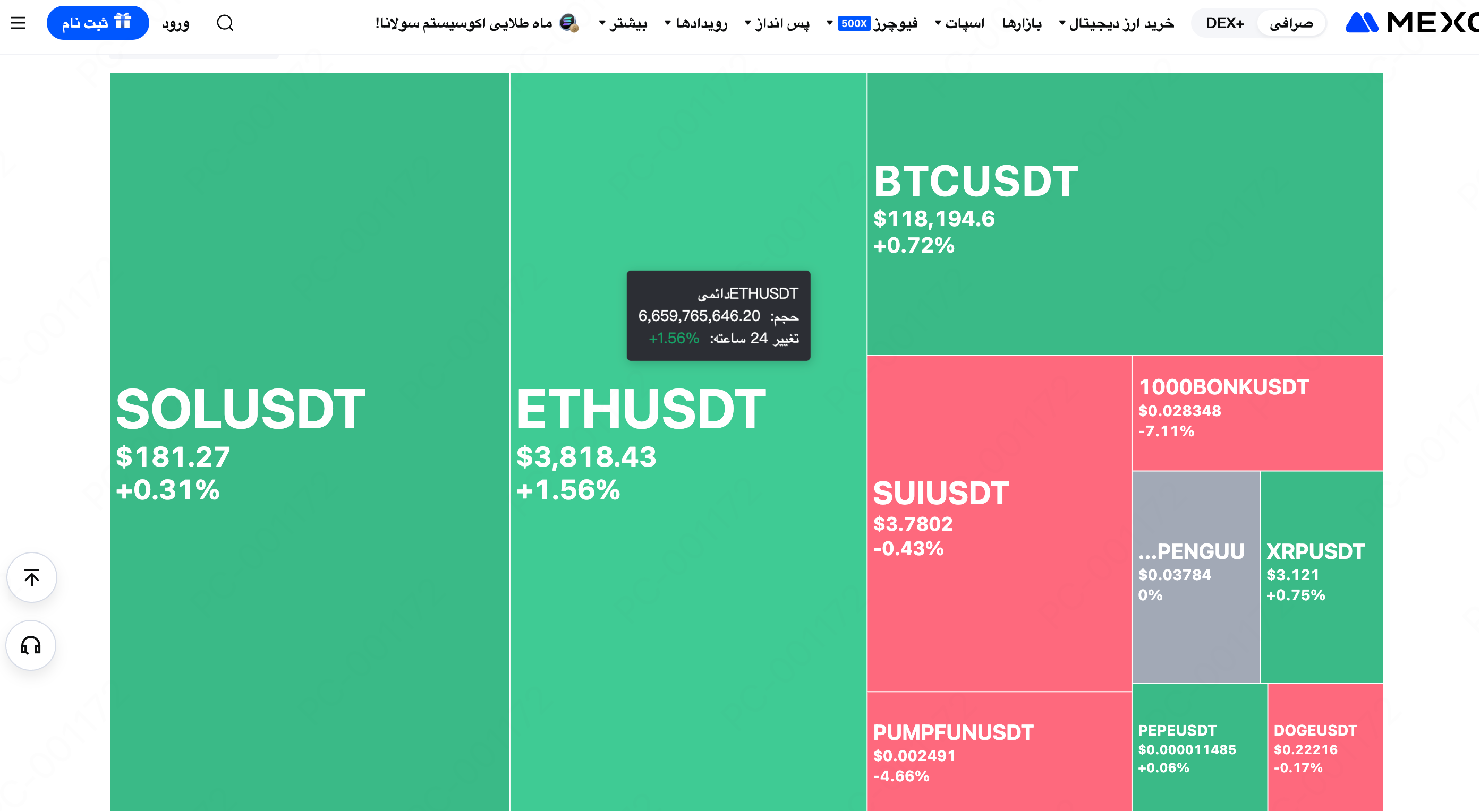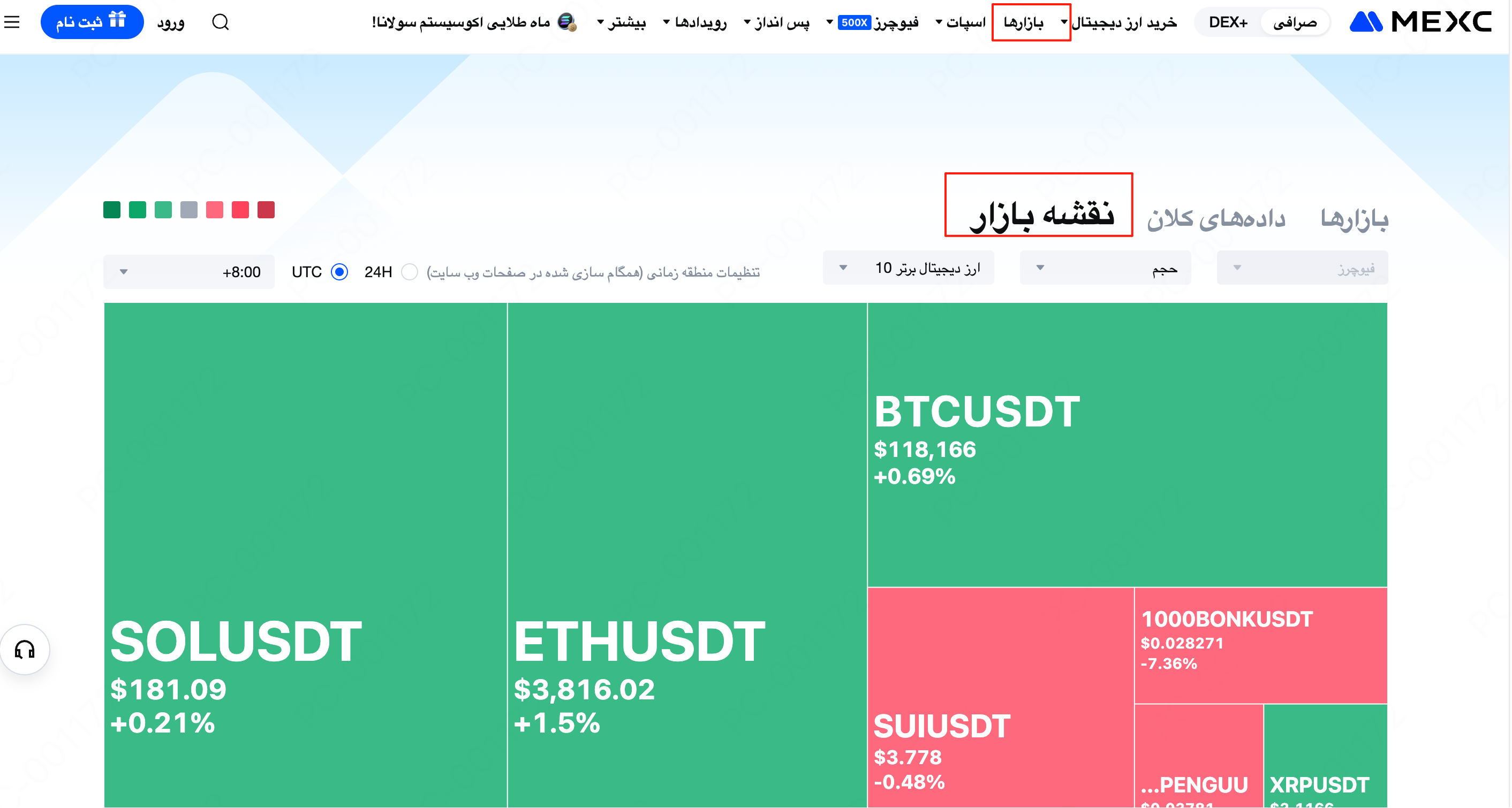 به وبسایت رسمی MEXC مراجعه کرده و وارد حساب کاربری خود شوید. از نوار ناوبری بالای صفحه، روی گزینهی Markets (بازارها) کلیک کنید. در صفحهی بازارها، گزینهی Heat Map (نقشه بازار) را انتخاب نمایید. با کلیک روی این بخش، نقشه حرارتی نمایش داده شده و میتوانید عملکرد قراردادهای فیوچرز را بهصورت گرافیکی مشاهده و تحلیل کنید.