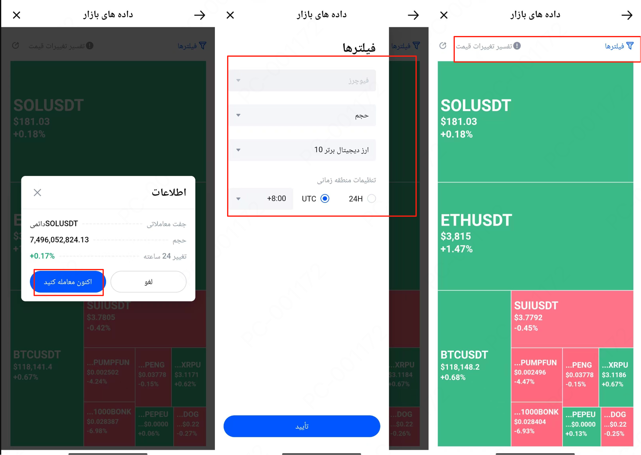 در صفحهی نقشه حرارتی اپلیکیشن MEXC، مراحل زیر را برای استفاده از فیلترها و مشاهده جزئیات دنبال کنید: