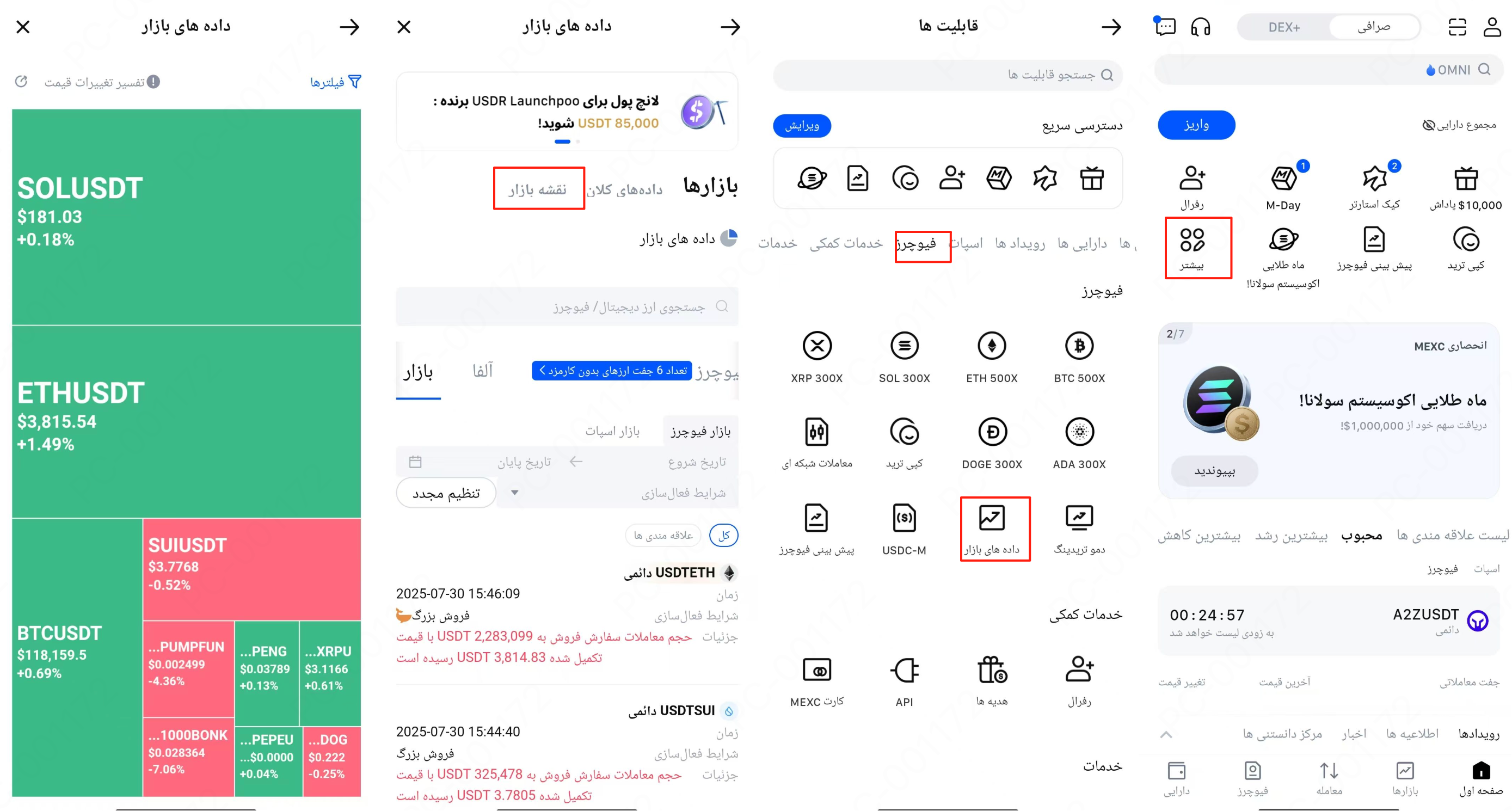 برای دسترسی به نقشه حرارتی قراردادهای فیوچرز در اپلیکیشن MEXC، مراحل زیر را دنبال کنید: اپلیکیشن MEXC را اجرا کرده و وارد حساب کاربری خود شوید. در صفحه اصلی، روی گزینهی More (بیشتر) ضربه بزنید. از منوی باز شده، وارد بخش Futures (فیوچرز) شوید. سپس گزینهی Market Data (دادههای بازار) را انتخاب کنید. در نهایت، روی گزینهی Heat Map (نقشه بازار) ضربه بزنید تا نمای گرافیکی بازار قراردادهای فیوچرز برای شما نمایش داده شود.