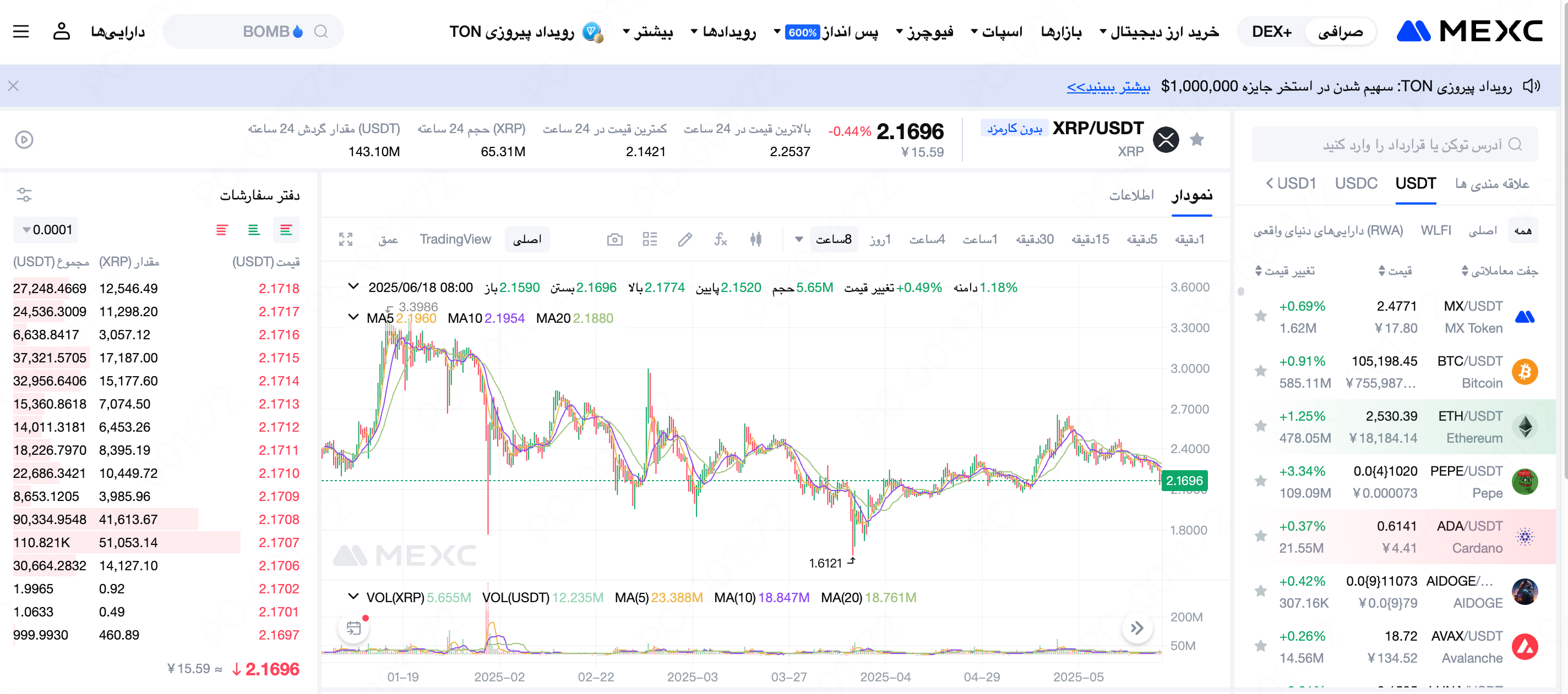 پلتفرم MEXC به عنوان پلتفرم برتر برای معامله XRP شناخته میشود و نقدینگی استثنایی، عمق دفتر سفارش قوی و کارمزدهای معاملاتی فوقالعاده رقابتی را ارائه میدهد. این پلتفرم نقدینگی فراوان، دفتر سفارش عمیق و کارمزدهای معاملاتی فوقالعاده پایین را ارائه میدهد و به سرمایهگذاران این امکان را میدهد که از تجربیات معاملاتی کارآمد لذت ببرند و در عین حال هزینهها را به حداقل و بازده را به حداکثر برسانند. میتوانید توکنهای XRP را در MEXC با کارمزدهای بسیار رقابتی معامله کنید.