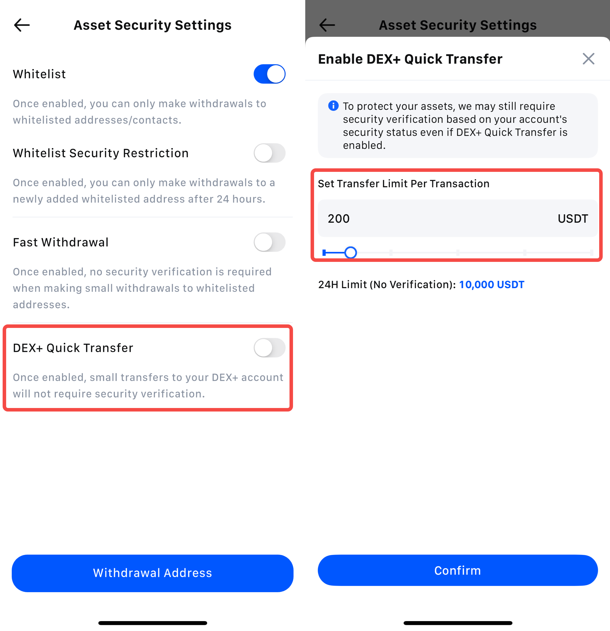 روی دکمه جابجایی کنار «انتقال سریع DEX+» کلیک کنید، محدودیت انتقال بدون تأیید (1 تا 2,000 USDT، مثلاً 200 USDT) را وارد کنید، سپس روی تأیید کلیک کنید.