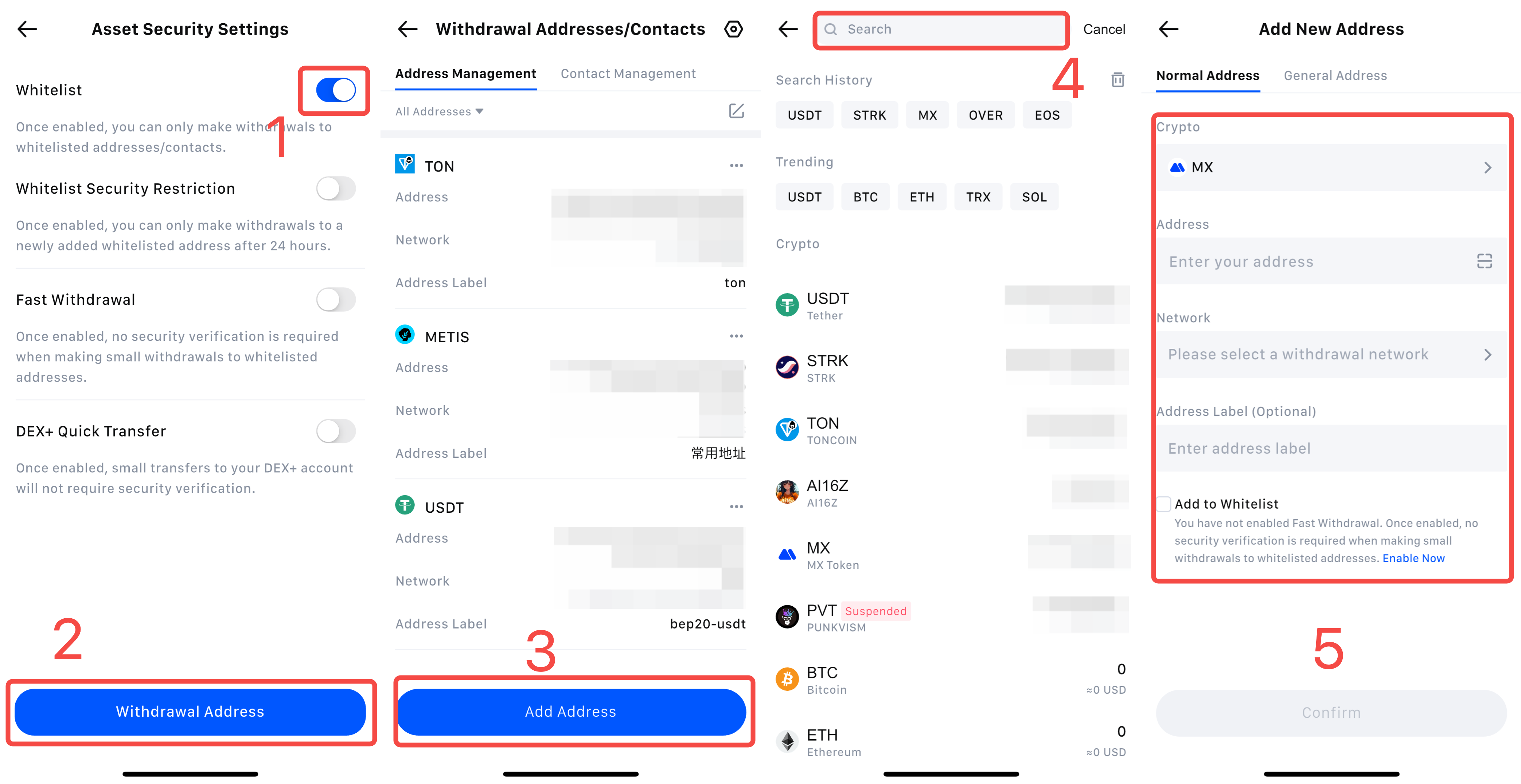 5) رمزارز، آدرس، جزئیات شبکه و غیره را وارد کنید. سپس، کادر کنار «افزودن به لیست سفید» را علامت بزنید و برای اتمام، روی تأیید ضربه بزنید.