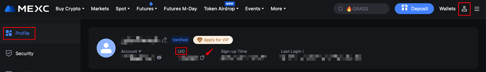 1. Après vous être connecté à votre compte MEXC, accédez à votre [Profil] et copiez votre identifiant utilisateur (UID) :