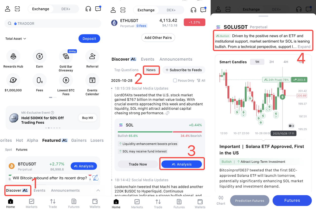 MEXC utilise des fonctionnalités d'IA de pointe pour vous aider à analyser scientifiquement les tendances du marché et à optimiser stratégiquement votre allocation d'actifs. Ce guide explore deux outils puissants : les bougies intelligentes et le consultant IA.