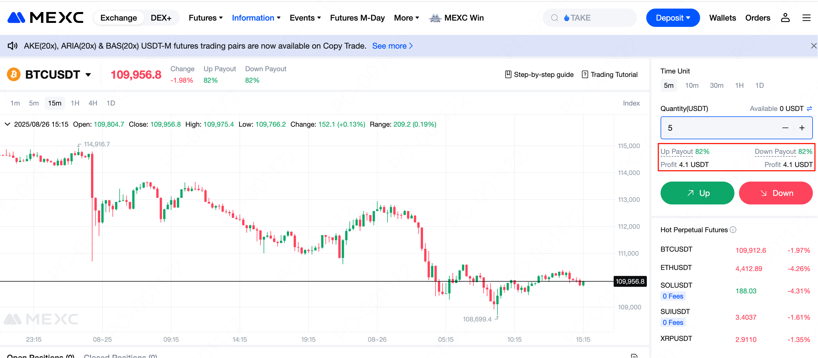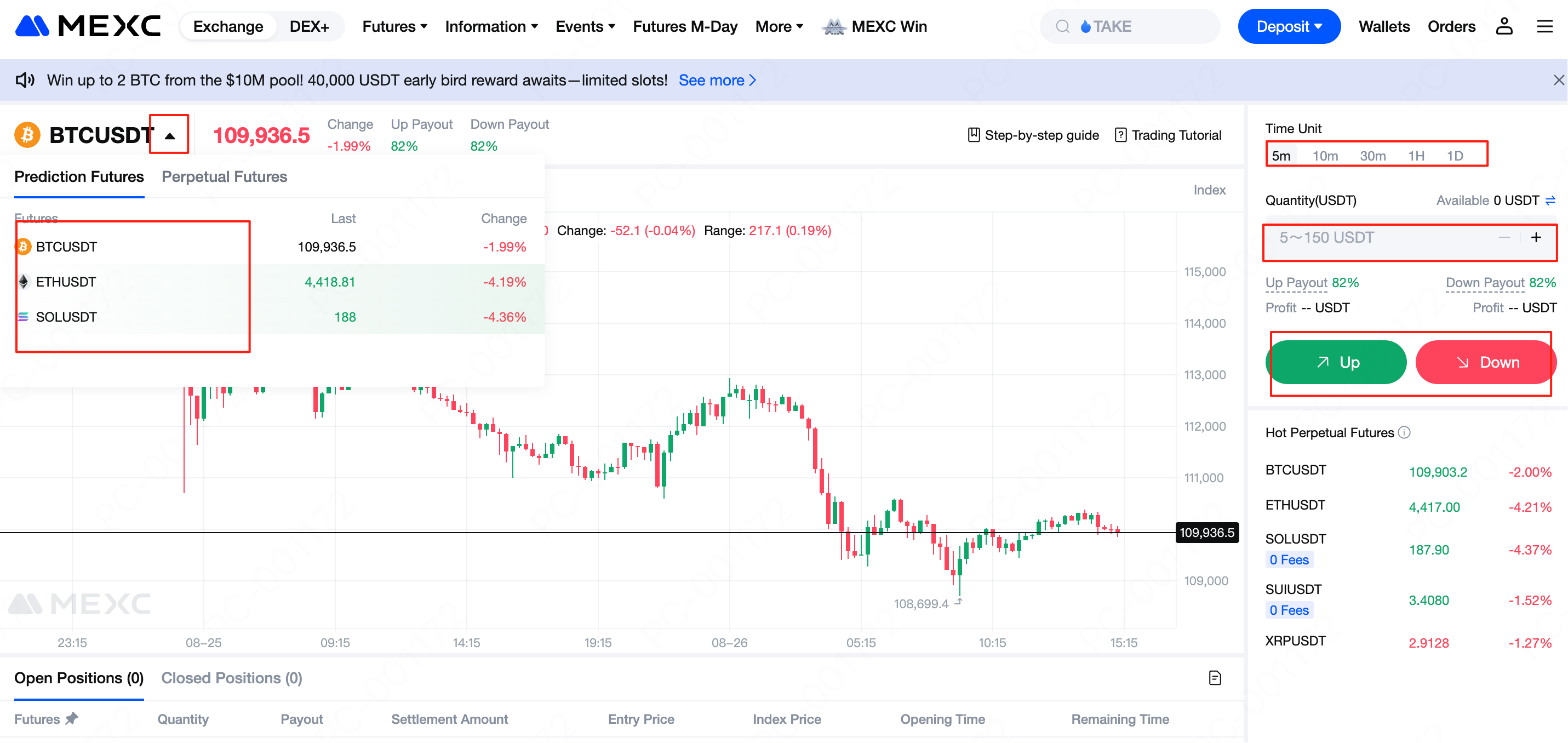 Connectez-vous à votre compte MEXC et accédez à la page de trading des contrats à terme de prédiction. Sélectionnez la paire de trading souhaitée, par exemple BTCUSDT. Choisissez la durée d'expiration (options disponibles : 5 minutes, 10 minutes, 30 minutes, 1 heure ou 1 jour). Saisissez la quantité de l'ordre, puis indiquez si vous pensez que le prix sera en hausse ou en baisse à l'expiration. Enfin, cliquez sur Confirmer pour valider votre transaction.