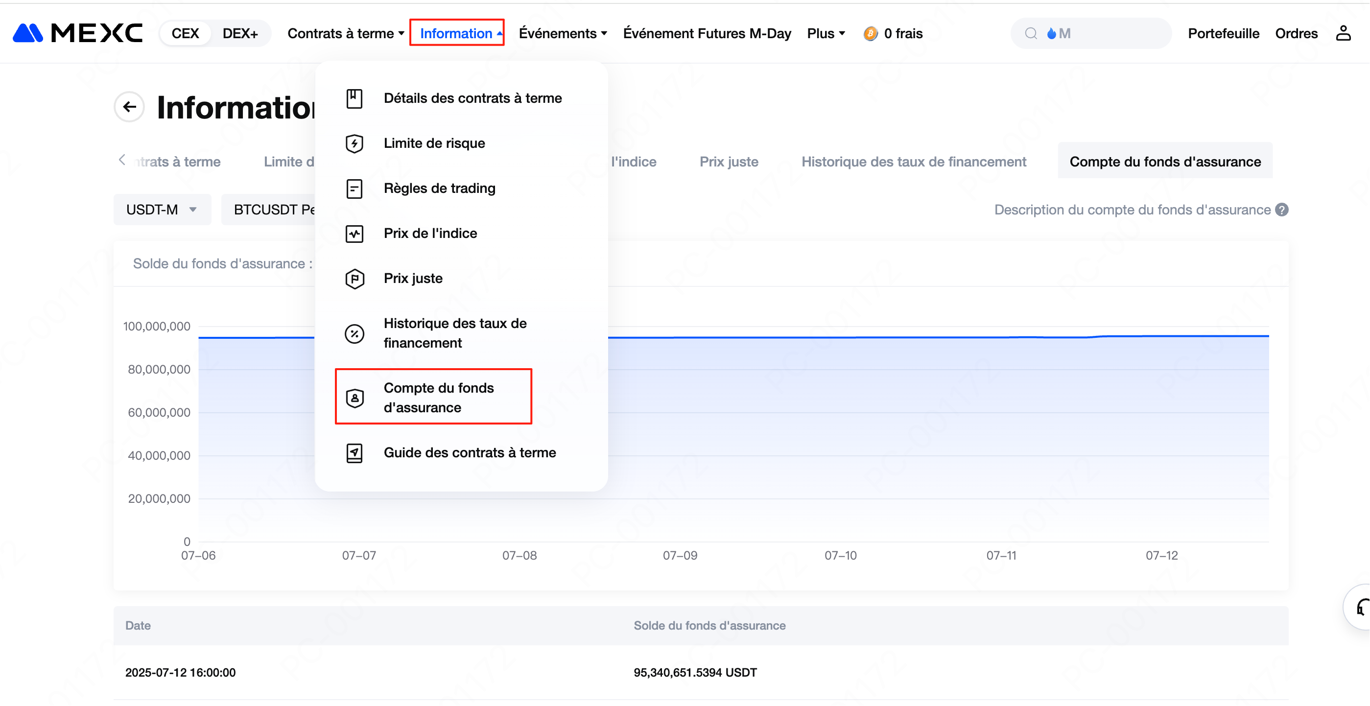 Les utilisateurs peuvent se connecter au site officiel de MEXC, puis se rendre dans la section Contrats à terme → Informations → Compte du fonds d'assurance, ou simplement cliquer sur ce lien pour consulter les soldes actuels et historiques du fonds d'assurance pour chaque paire de trading. Les données sont mises à jour régulièrement et sont entièrement ouvertes et transparentes.