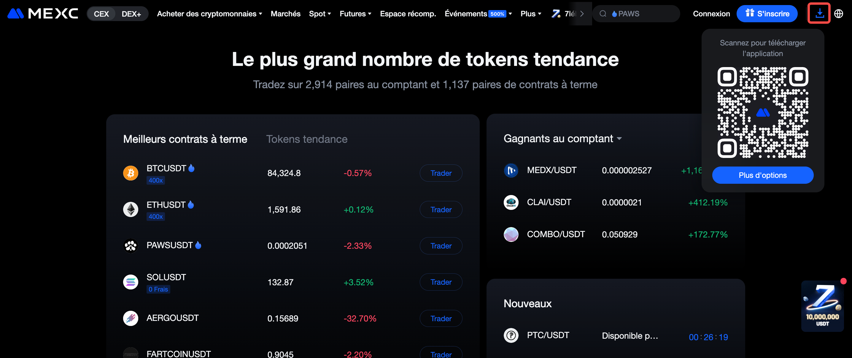 Rendez-vous sur le site officiel de MEXC et connectez-vous. Déplacez le curseur vers le coin supérieur droit de la page : l'icône « Scanner pour télécharger l'application » s'affichera. Scannez le code QR avec votre téléphone, puis suivez les instructions à l'écran pour finaliser l'installation.