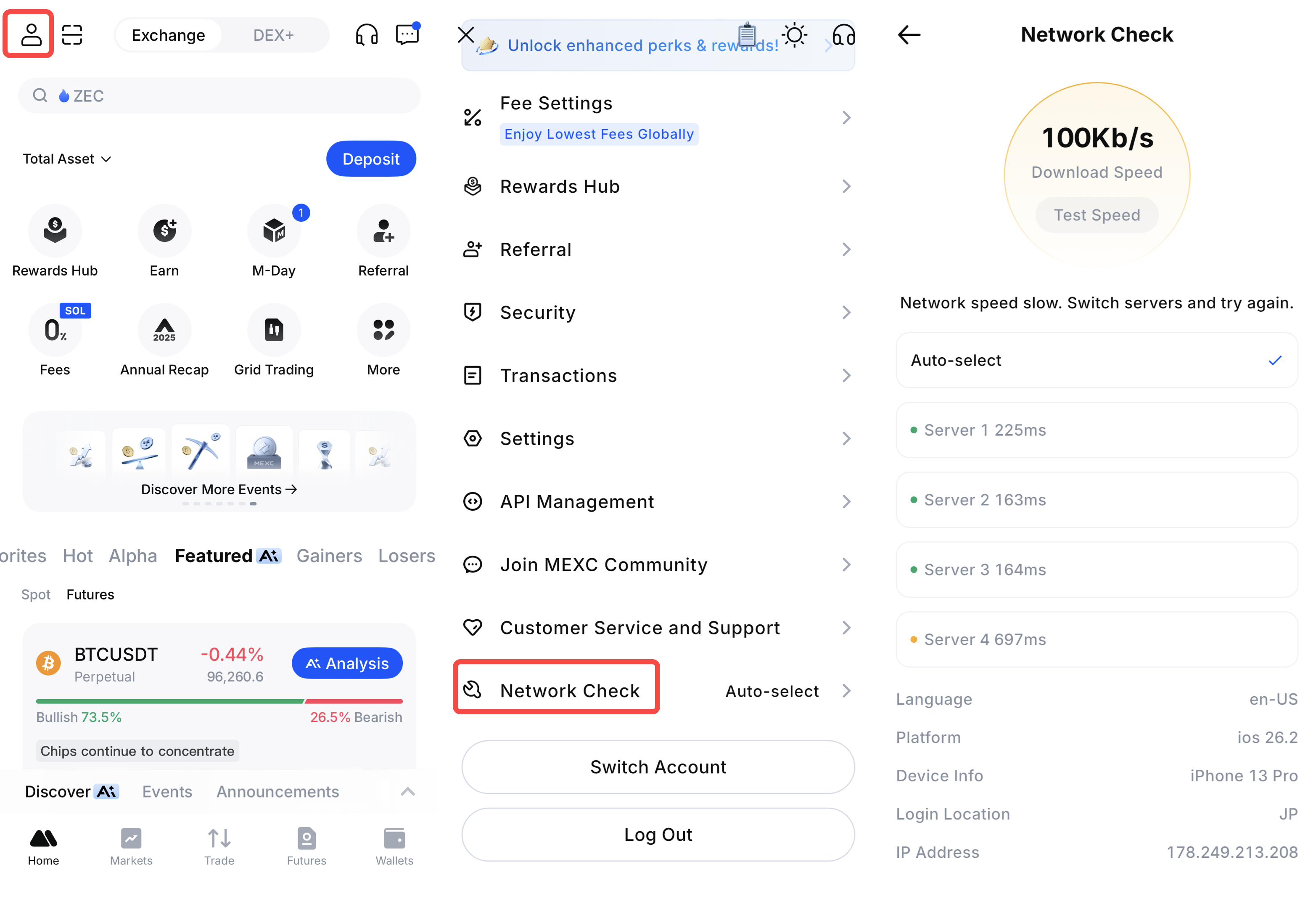 Dans l'application MEXC, appuyez sur l'icône de profil sur la page d'accueil, puis sélectionnez Vérification du réseau. En fonction des résultats du test, effectuez les actions correspondantes :