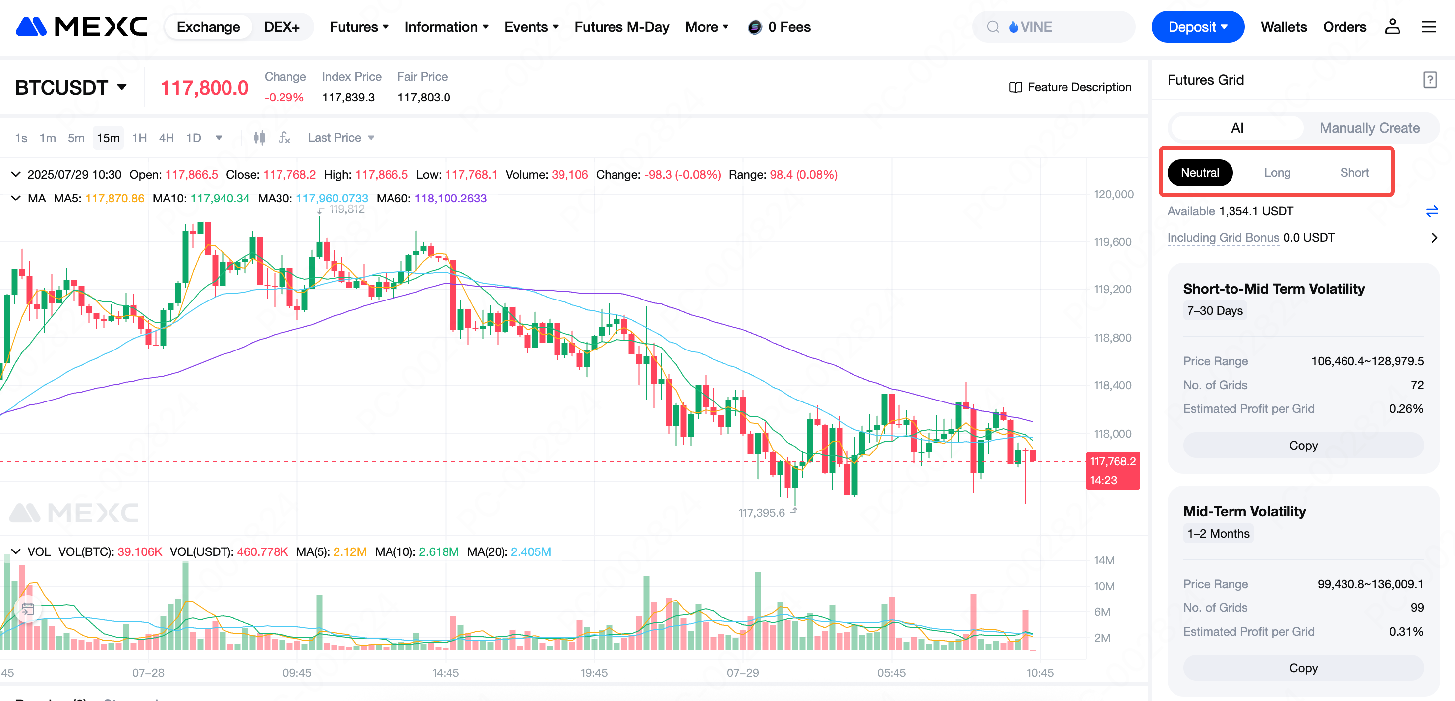 Per usare l'IA: vai alla pagina di Grid trading e, sul lato destro, nella sezione Crea griglia, seleziona la modalità IA.