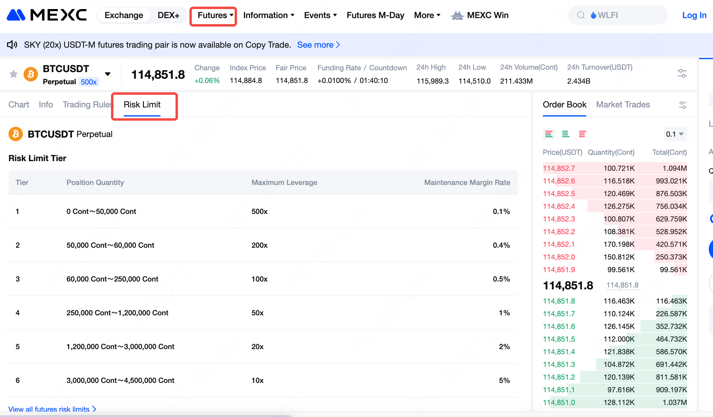 Sul sito web ufficiale di MEXC, clicca su Futures dalla barra di navigazione in alto per entrare nella pagina di trading di Futures. Poi seleziona Limite di rischio e clicca su Visualizza tutti i limiti di rischio di Futures per accedere ai dettagli dei livelli di limite di rischio.
