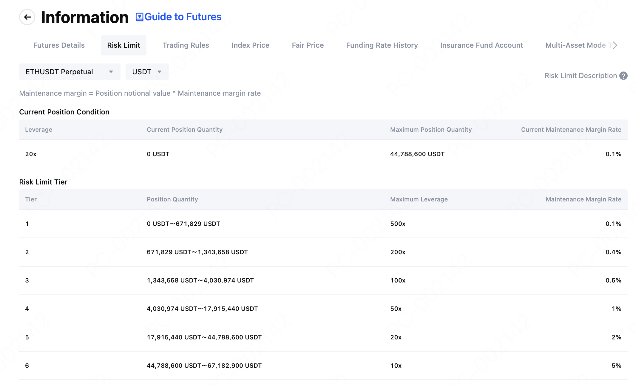Come mostrato nei livelli di limite di rischio del contratto Futures perpetuo ETHUSDT, maggiore è la quantità di posizione, più alto sarà il tasso di margine di mantenimento richiesto. Ad esempio, se la tua quantità di posizione rientra nell’intervallo 0~671,829 USDT, il tasso di margine di mantenimento applicabile è dello 0.1%. Se invece la quantità di posizione aumenta all’intervallo 17,915,440~44,788,600 USDT, il tasso applicabile sale al 2%.