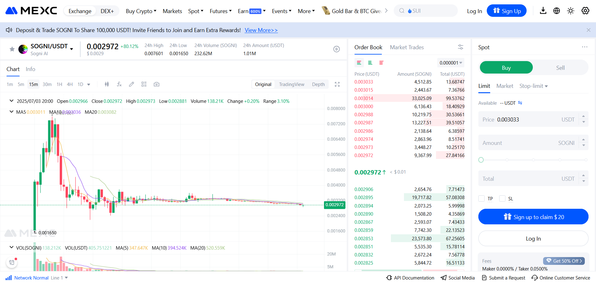 2) Cerca "SOGNI" nella barra di ricerca e seleziona il trading Spot 3) Scegli il tipo di ordine, inserisci i parametri di importo e prezzo e completa la transazione