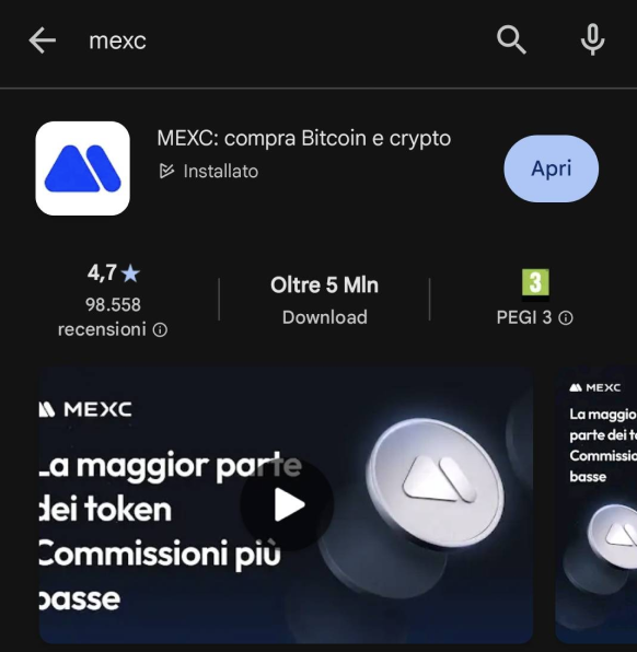 Apri il Play Store di Google dal tuo cellulare, cerca l'app MEXC nella barra di ricerca e fai tap su Installa. Una volta completata l'installazione, l'app sarà pronta per essere utilizzata.