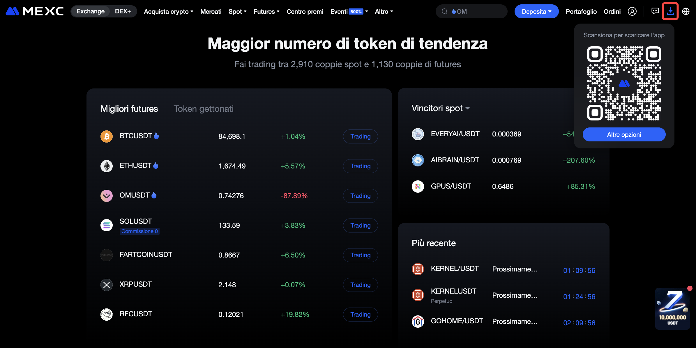Cerca e accedi al sito web ufficiale di MEXC. Con il cursore, vai nell'angolo in alto a destra della pagina, dove apparirà l'icona "Scansiona per scaricare l'app". Scansiona il codice QR sulla pagina con il tuo cellulare e segui i passaggi per completare l'installazione.