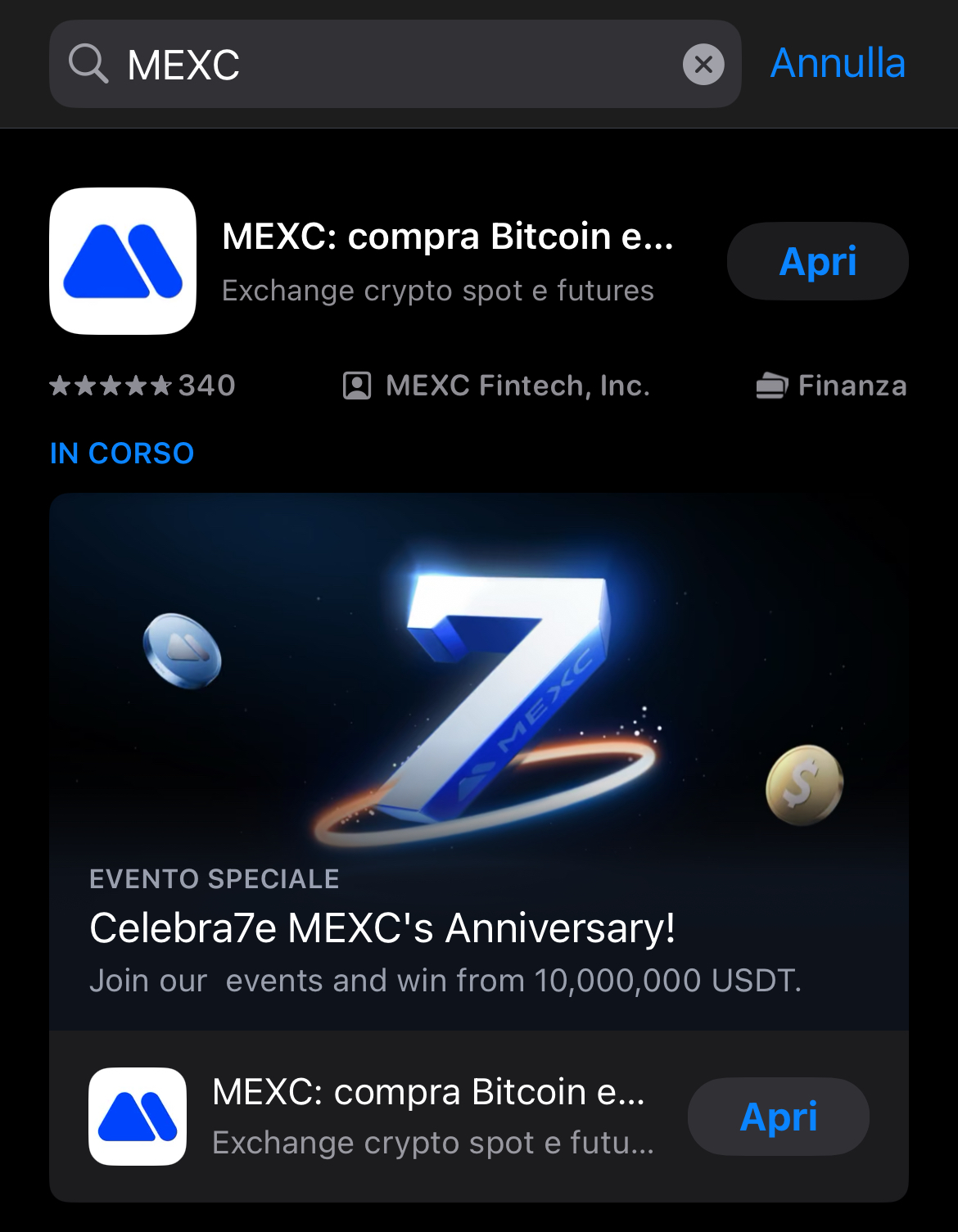 Apri l'App Store di Apple dal tuo cellulare, cerca l'app MEXC nella barra di ricerca e fai tap su Installa. Una volta completata l'installazione, l'app sarà pronta per essere utilizzata.