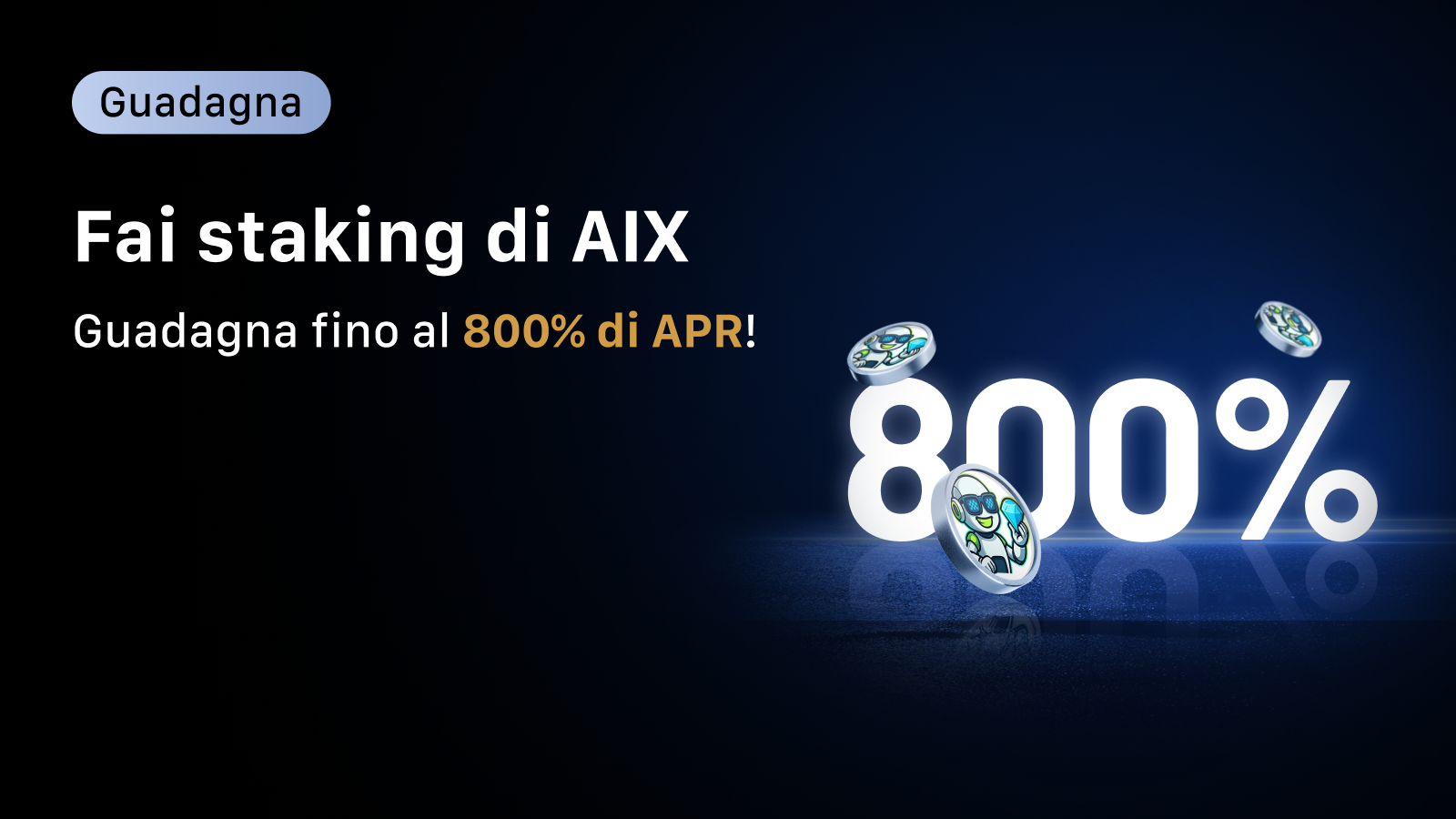 Desideri aumentare il tuoi AIX senza sforzo? Non perdere il Gala di staking di AIX, un evento di staking a tempo limitato in cui puoi guadagnare fino all'800% di APR senza alcuna difficoltà.