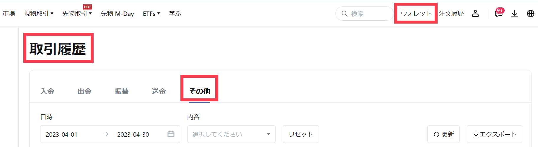 MEXCアカウントにログイン→ [ウォレット] をクリック→ [ 取引履歴] をクリック→ [その他] をクリック