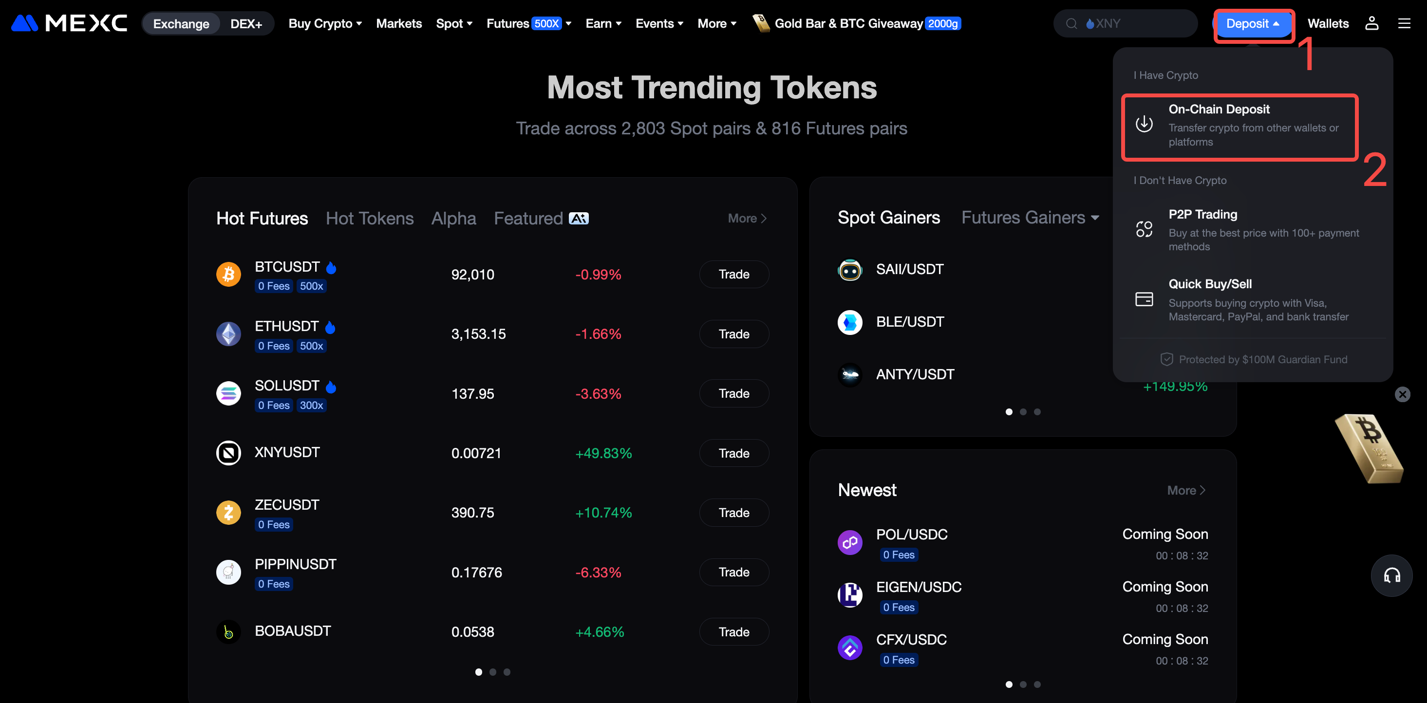 MEXC公式ウェブサイトを開き、アカウントにログインします。ホームページで [ウォレット] に移動し、[入金] をクリックします。次に [オンチェーン入金] を選択して入金ページを開きます。