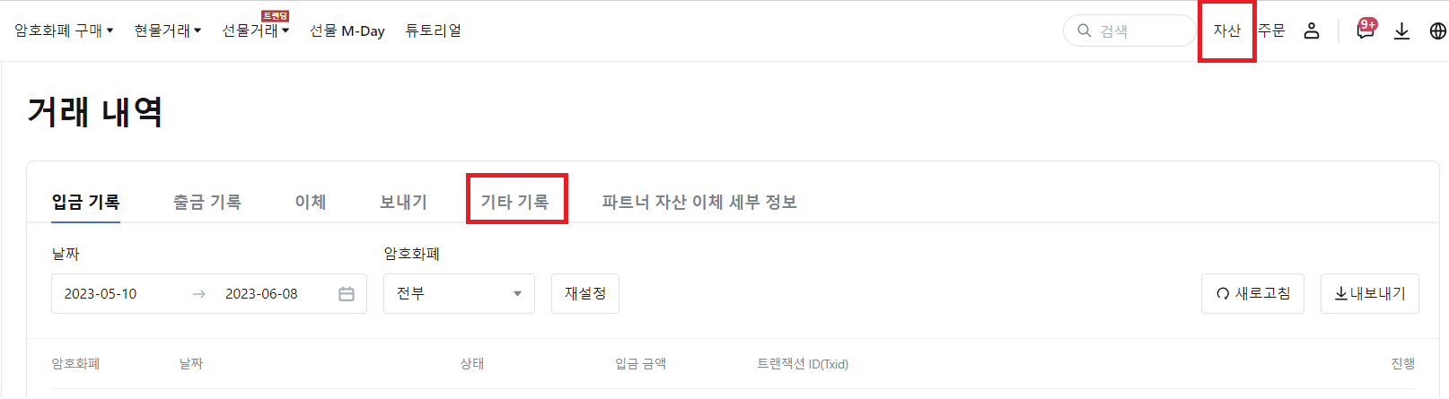 MEXC 계정 로그인 - 자산 클릭 - 거래 내역 클릭 - 기타 기록 클릭