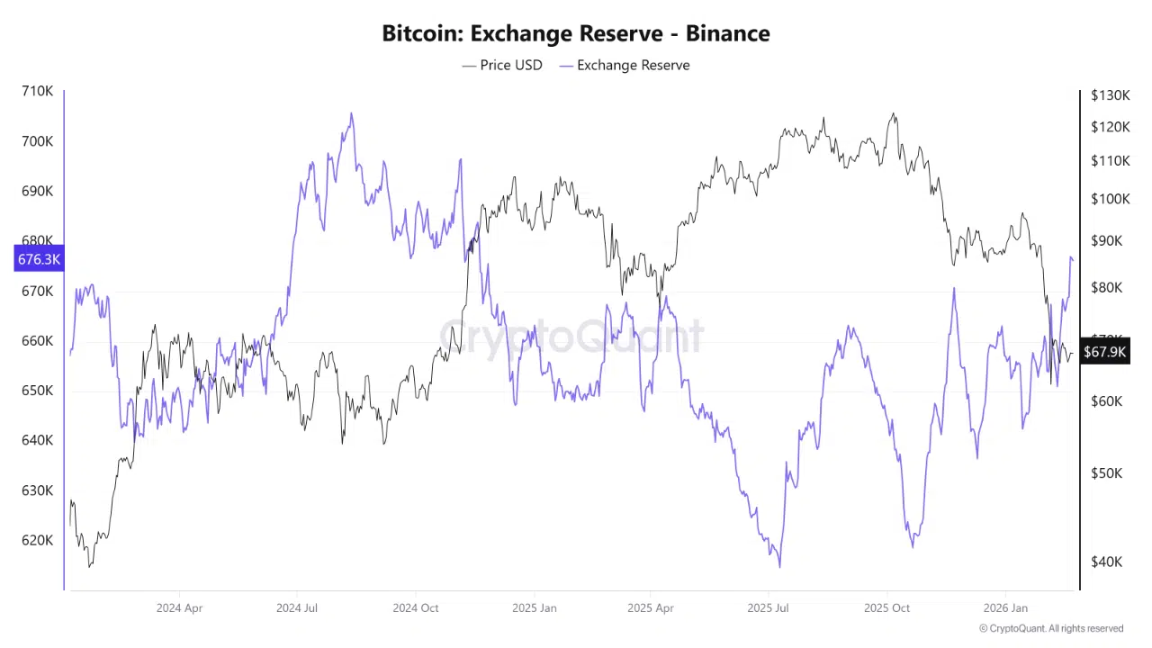Binance’s Bitcoin reserve has risen to approximately 676,860 BTC, marking one of the highest readings since 2024.