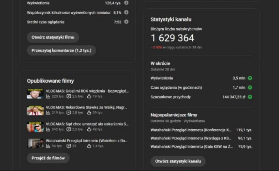 Co do zysków i monetyzacji, to duża ich część zależy od wyświetleń na YouTube. Średnia wyświetleń filmów za rok 2025 Książula wyniosła blisko 36 mln odtworzeń miesięcznie. Do kalkulacji możemy użyć zarobków innego dużego twórcy – Sylwestra Wardęgi. Pod koniec zeszłego roku pokazał, że za 3,5 mln wyświetleń dostał prawie 150 000 PLN.