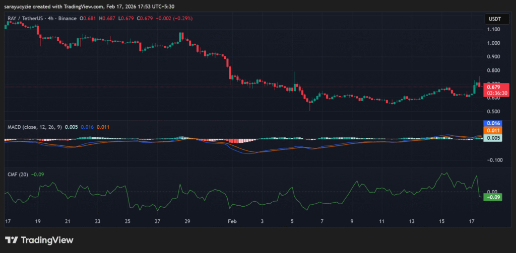 Przyglądając się bliżej 4-godzinnemu wykresowi handlowemu Raydium, widoczna jest presja wzrostowa, a cena może wzrosnąć w kierunku oporu na poziomie $0,6852. Jeśli zwyżkowa trajektoria zostanie wzmocniona, może to doprowadzić do pojawienia się złotego krzyża i wysłać cenę do zakresu $0,69 lub nawet wyżej.