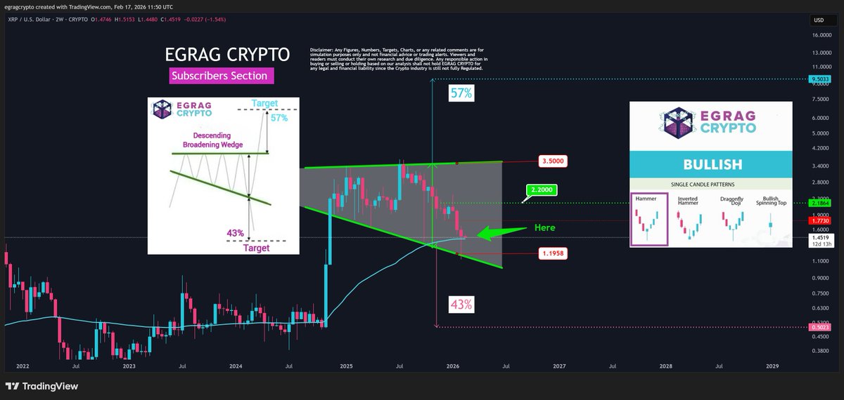Zgodnie z analizą udostępnioną przez EGRAG CRYPTO, XRP właśnie wykreślił byczą świecę Hammer na 2-tygodniowym interwale czasowym, przy czym korpus świecy zamknął się powyżej 100 EMA.
