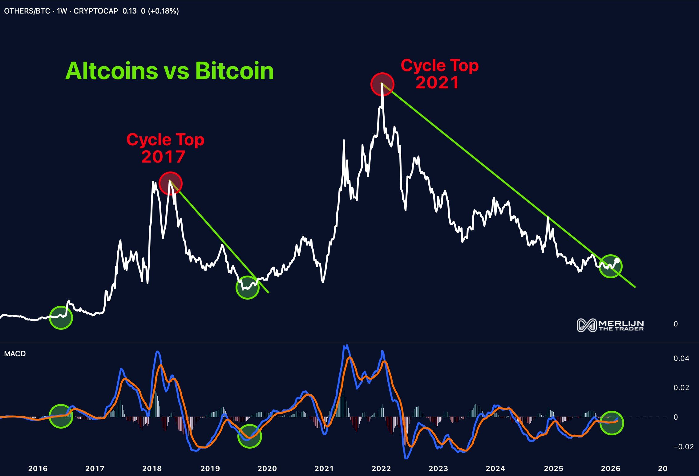 Jednak obecny cykl może różnić się od poprzednich. Trader Merlijn The Trader wskazuje, że para ALT/BTC przestała spadać i weszła w fazę konsolidacji. Może to oznaczać wczesny etap zmiany trendu. Analityk rynku kryptowalut wytłumaczył: