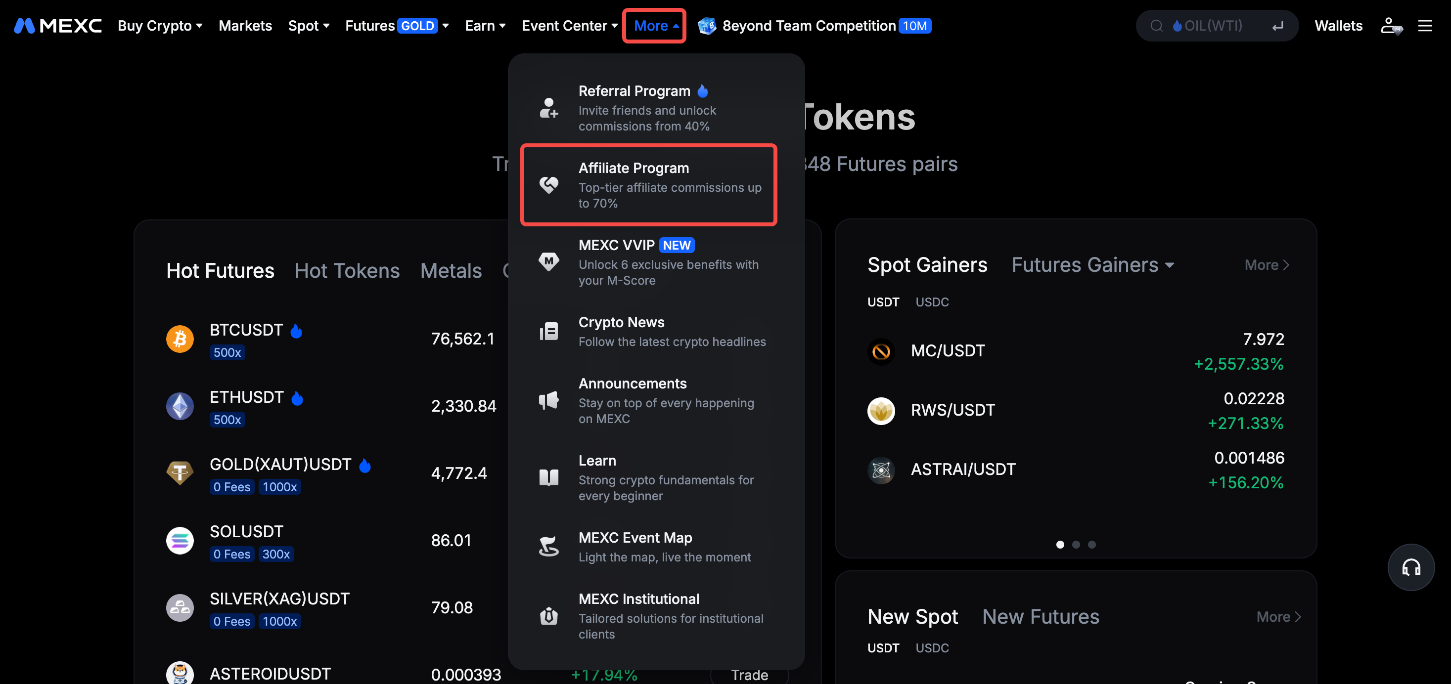 Log in to the MEXC official website, click on the More menu at the top of the homepage, and select Affiliate Program.