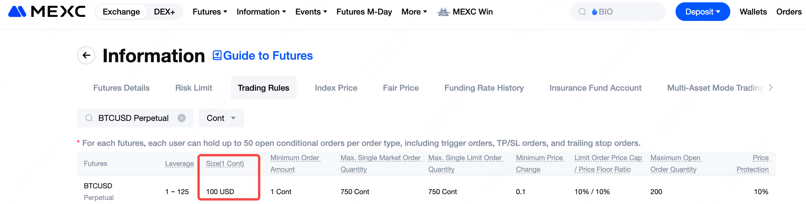 Ao contrário dos Futuros USDT-M da MEXC, que podem ter diferentes faixas de alavancagem dependendo do par, tanto os Futuros Perpétuos BTCUSD quanto os Futuros Perpétuos ETHUSD suportam alavancagem de 1x a 125x.