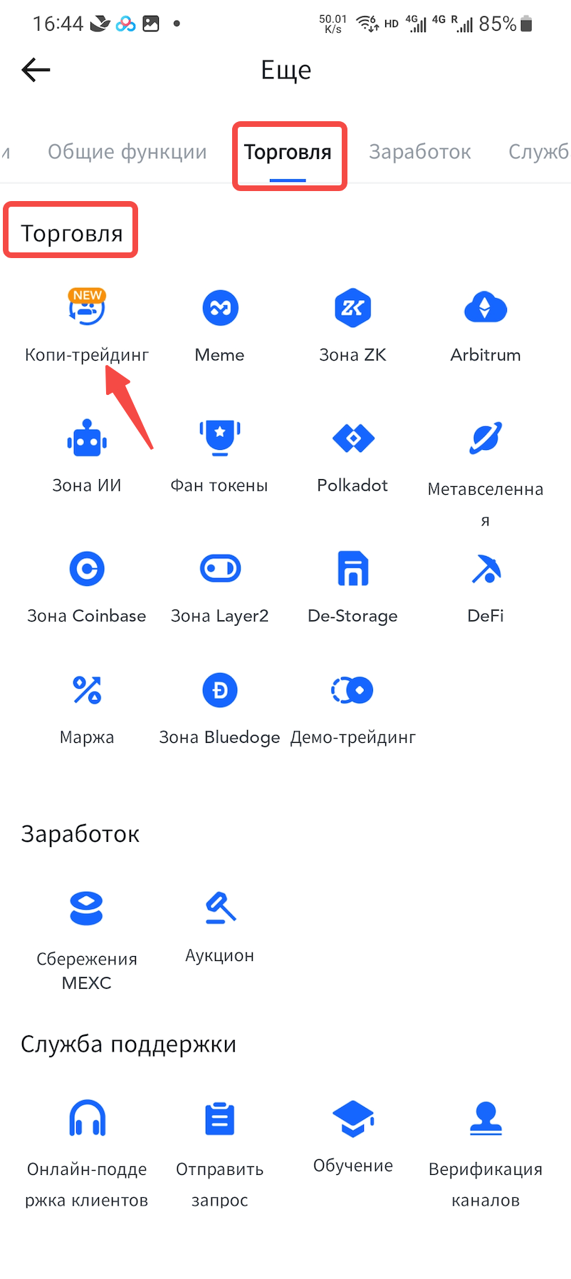 Как найти копи-трейдинг:Приложение > Еще > Торговля > Копи-трейдинг
