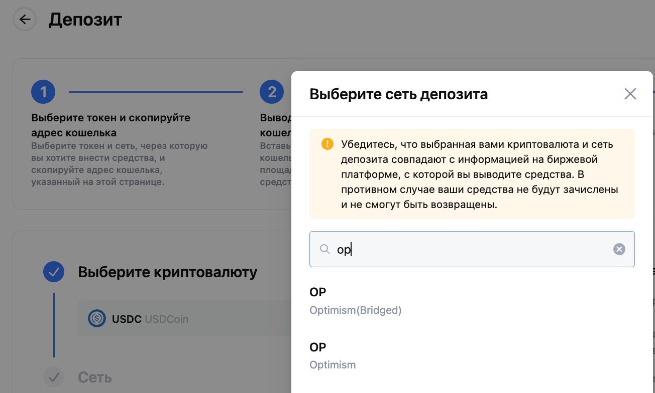 - На странице депозита/вывода сетевое имя собственной монеты USD (USDC) в сети Optimism будет отображаться как Optimism. Пожалуйста, подтвердите свои действия перед депозитом/выводом средств, чтобы избежать потери активов.