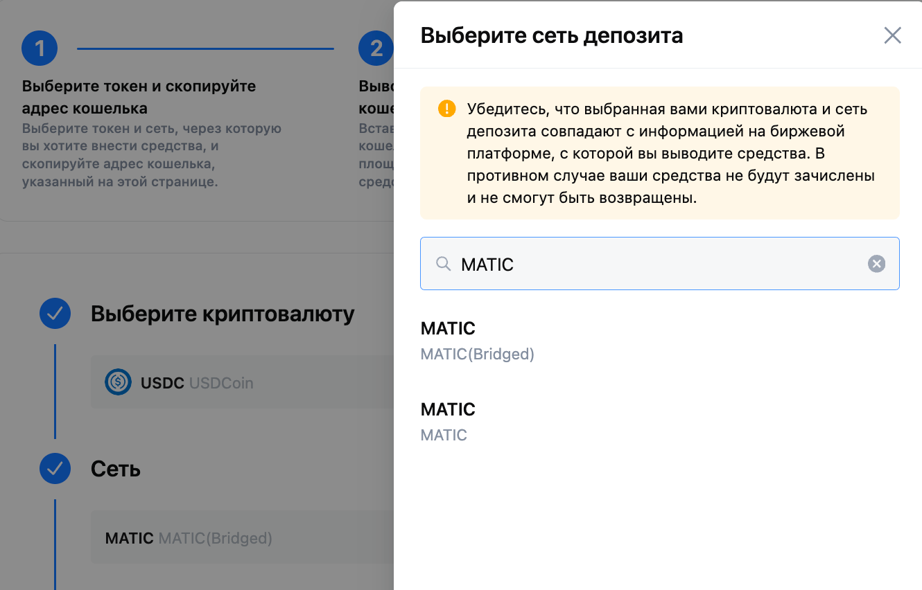 • На странице депозита/вывода средств сетевое имя нативного токена USD Coin (USDC) в сети Polygon будет отображаться как MATIC. Во избежание потерь активов просим вас подтверждать депозит/вывод средств.