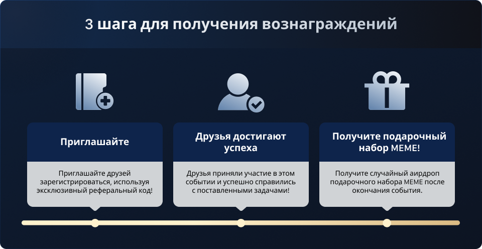 В период проведения события друзья, успешно зарегистрировавшиеся по вашему реферальному коду и выполнившие любое из вышеперечисленных заданий, получат в награду случайный подарочный набор мемкоинов стоимостью 10 USDT.