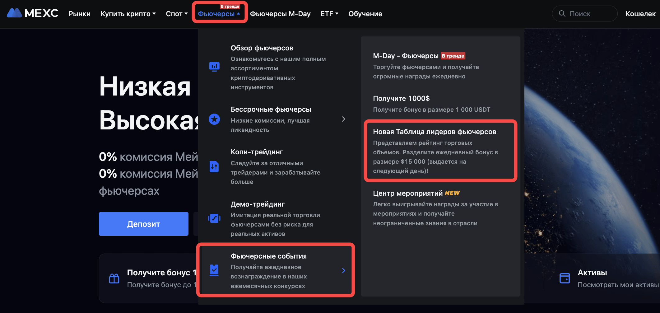 Веб-сайт: Зайдите на главную страницу MEXC (https://www.mexc.com/ru-RU), нажмите на [Фьючерсы] навигационной панели и, далее, нажмите на [Новая Таблица лидеров фьючерсов].